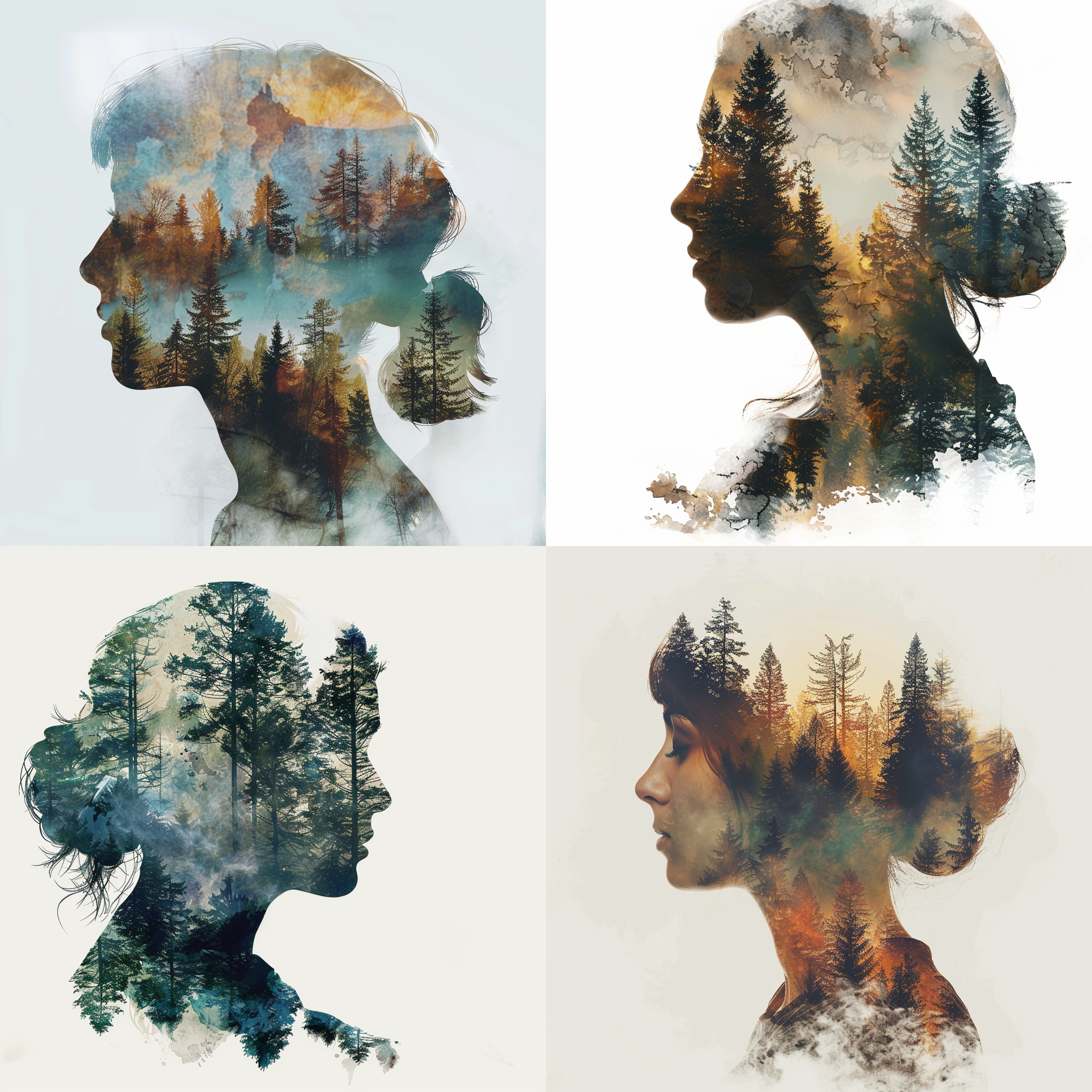 Double exposure of portrait and forest, nature scenery, watercolor art